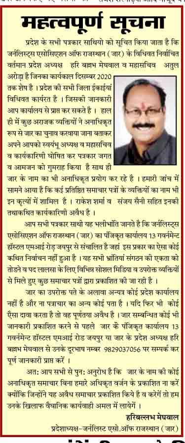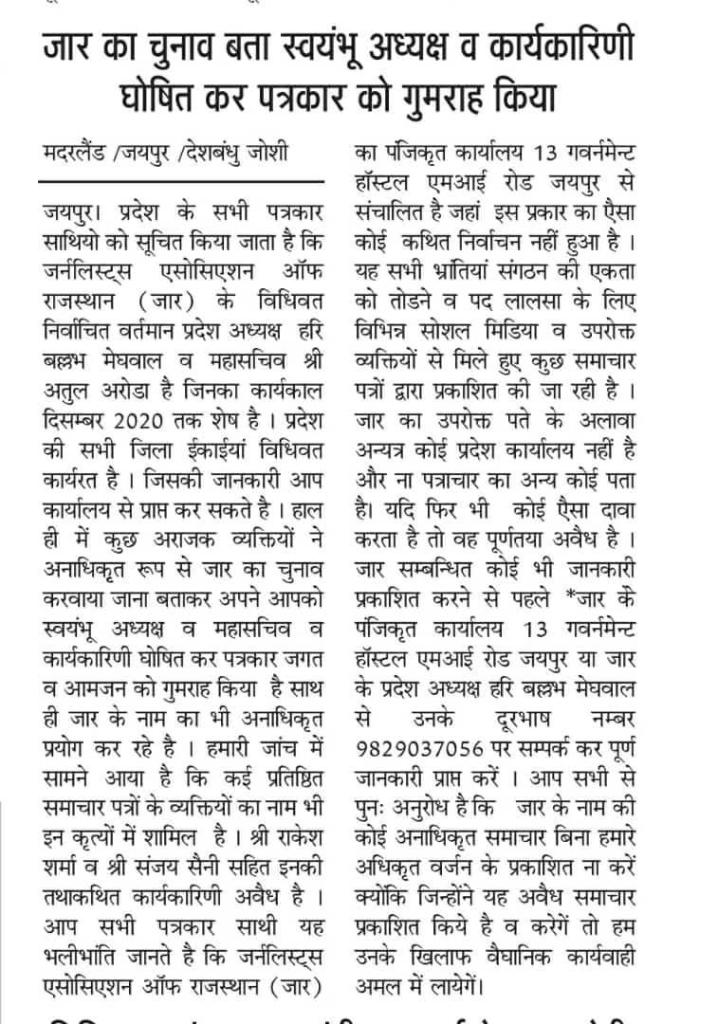 आप सभी पत्रकार साथी यह भलीभांति जानते है कि जर्नलिस्ट्स एसोसिएशन आॅफ राजस्थान (जार) का पंजिकृत कार्यालय 13 गवर्नमेन्ट हाॅस्टल एमआई रोड जयपुर से संचालित है जहां इस प्रकार का एैसा कोई कथित निर्वाचन नहीं हुआ है । यह सभी भ्रांतियां संगठन की एकता को तोडने व पद लालसा के लिए विभिन्न सोशल मिडिया व उपरोक्त व्यक्तियों से मिले हुए कुछ समाचार पत्रों द्वारा प्रकाशित की जा रही है ।