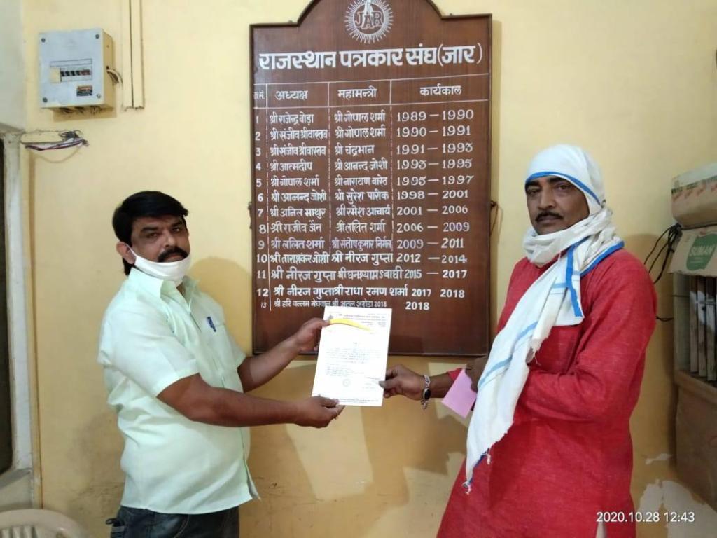 जयपुर। जर्नलिस्ट एसोसिएशनऑफ राजस्थान के प्रदेशाध्यक्षहरिबल्लभ मेघवाल व प्रदेश महासचिव अतुल अरोड़ा की अनुशंसा पर जार के विस्तार के तहत देशबंधु जोशी को संगठन की मजबूती व जार की जिला इकाई हितों के लिए सृजनात्मक कार्य करने के लिये अलवर जिलाध्यक्ष के पद पर नियुक्त किया गया है। इस अवसर पर प्रदेश कार्यालय 13 गवर्मेंट हॉस्टल जयपुर पर नियुक्ति ग्रहण करते समय जार जयपुर जिला संयोजक दीपक शर्मा , मुकेश मिश्रा जयपुर जिला उप संयोजक , हरिनाम सिंह प्रदेश कार्यकारिणी सदस्य व अन्य जार सदस्य मौजूद रहे।
