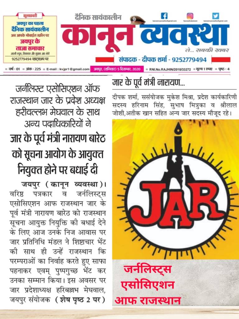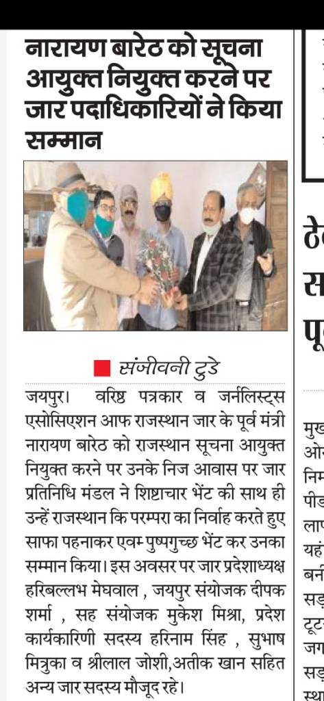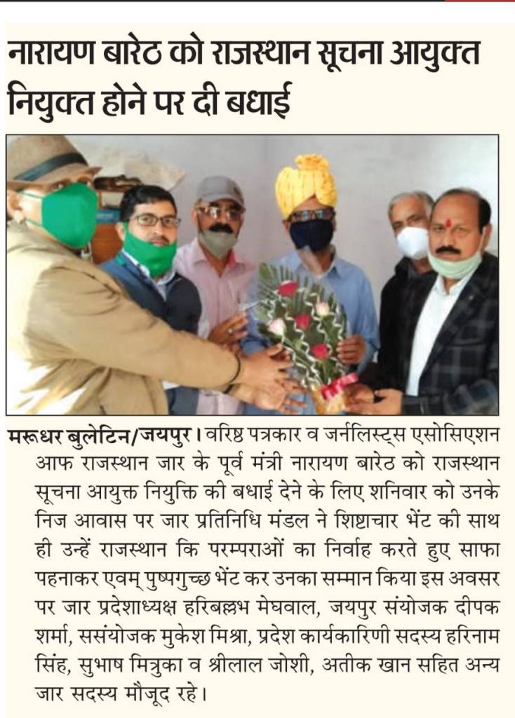 वरिष्ठ पत्रकार व जर्नलिस्ट्स एसोसिएशन आफ राजस्थान जार के पूर्व मंत्री नारायण बारेठ को राजस्थान सूचना आयुक्त नियुक्ति की बधाई देने के लिए आज उनके निज आवास पर जार प्रतिनिधि मंडल ने शिष्टाचार भेंट की साथ ही उन्हें राजस्थान कि परम्पराओं का निर्वाह करते हुए साफा पहनाकर एवम् पुष्पगुच्छ भेंट कर उनका सम्मान किया