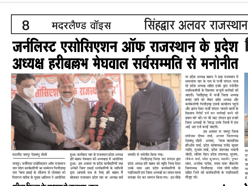 जर्नलिस्ट एसोसिएशन ऑफ राजस्थान के प्रदेशअ ध्यक्ष हरीबल्लभ मेघवाल सर्वसम्मति से मनोनीत पर प्रदेश अध्यक्ष बल्लभ ने कहा राजस्थान में समानांतर जार के नाम से फर्जी संगठन चला रहे प्रदेश अध्यक्ष सहित इनके द्वारा मनोनीत पदाधिकारियों के खिलाफ कानूनी कार्रवाई की जाएगी। चित्तौड़गढ़ में फर्जी जिला अध्यक्ष बनाए जाने को लेकर प्रदेश अध्यक्ष और कार्यकारिणी चित्तौड़गढ़ एसपी कार्यालय पहुंचे और ज्ञापन देकर फर्जी संगठन चलाने वालों के खिलाफ रिपोर्ट दर्ज कर कार्रवाई करने की प्रबल मांग की। जार संगठन द्वारा फर्जी जिला अध्यक्षों के विरुद्ध उनके जिलों में एफ आई आर भी दर्ज कराई जाएगी।