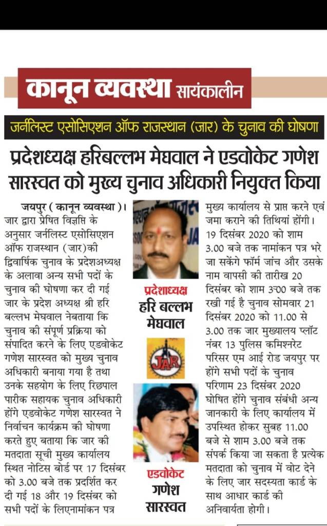जार द्वारा प्रेषित विज्ञप्ति के अनुसार जर्नलिस्ट एसोसिएशन ऑफ राजस्थान (जार)की द्विवार्षिक चुनाव के प्रदेश अध्यक्ष केअलावा अन्य सभी पदों के चुनाव की घोषणा कर दी गई जार के प्रदेश अध्यक्ष श्री हरि बल्लभ मेघवाल नेबताया कि चुनाव की संपूर्ण प्रक्रिया को संपादित करने के लिए एडवोकेट श्री गणेश सारस्वत को मुख्य” चुनाव अधिकारी बनाया गया है तथा उनके सहयोग के लिए श्री रिछपाल पारीक सहायक चुनाव अधिकारी होंगे