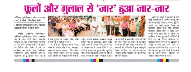 होली के अवसर पर जर्नलिस्ट एसोसिएशन ऑफ राजस्थान (जार) मुख्यालय पर जयपुर इकाई की ओर से 27 मार्च को दोपहर 1 बजे से 4 बजे तक होली मिलन समारोह का आयोजन किया जाएगा।