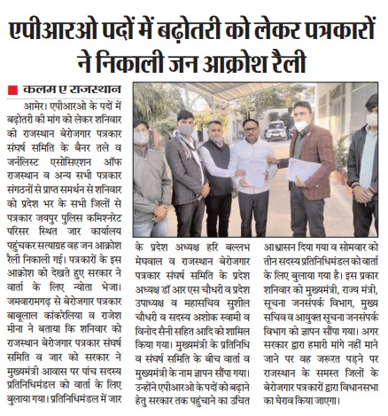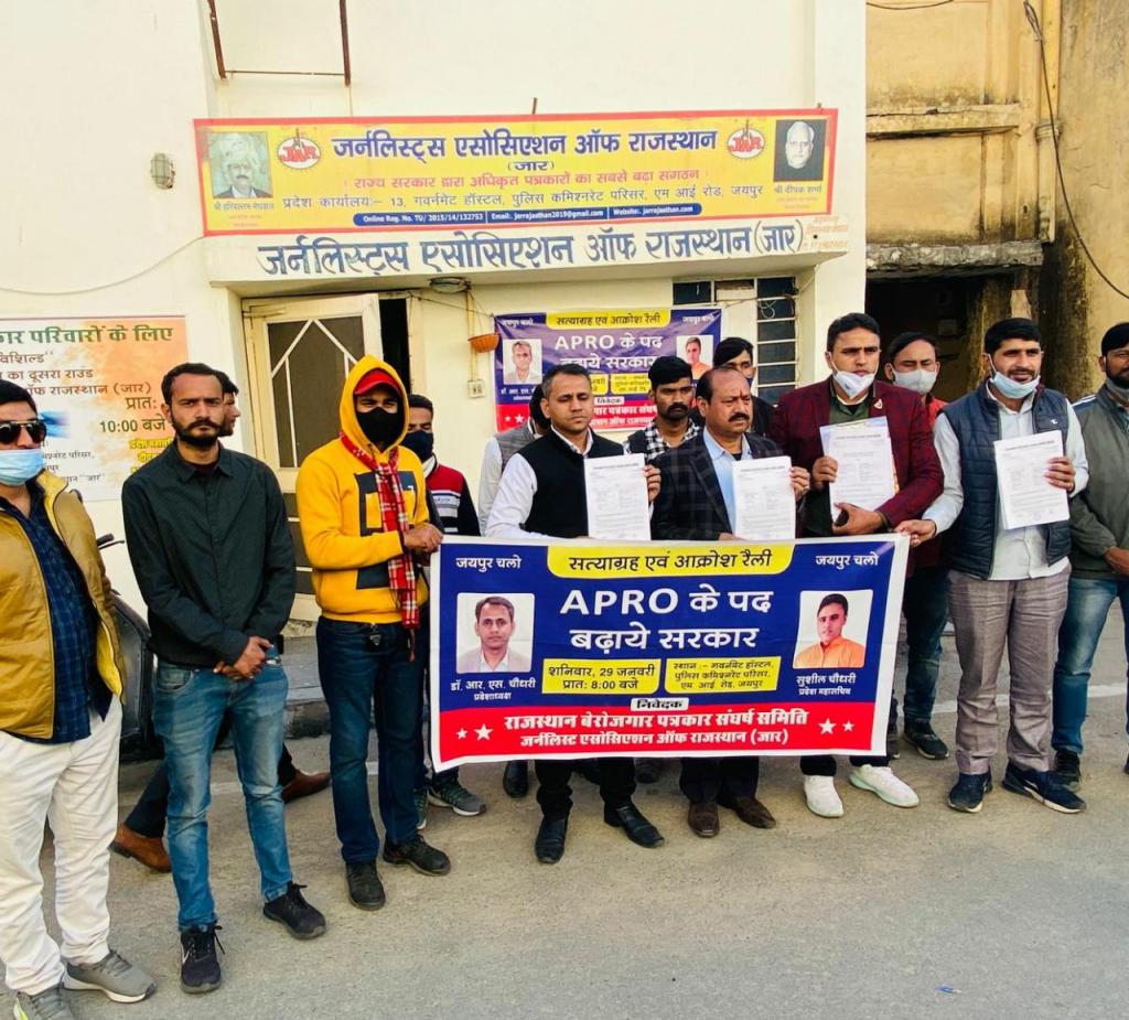 एपीआरओ के पदों में बढ़ोतरी की मांग को लेकर आज जर्नलिस्ट्स एसोसिएशन आफ राजस्थान जार व अन्य कई पत्रकार संगठनों से समर्थन प्राप्त राजस्थान बेरोजगार पत्रकार संघर्ष समिति के बैनर तले प्रदेश के सभी जिलों से पत्रकारों ने पुलिस कमिश्नरेट परिसर स्थित पत्रकार संगठन जार मुख्यालय पहुंचकर सत्याग्रह व जनाक्रोश रैली निकाली |पत्रकारों के आक्रोश को देखते हुए सरकार ने पाँच सदस्य के प्रतिनिधि मण्डल को वार्ता के लिये बुलाया | प्रतिनिधि मण्डल में जार प्रदेशाध्यक्ष हरीबल्लभ मेघवाल राजस्थान बेरोजगार पत्रकार संघर्ष समिति प्रदेशाध्यक्ष डाक्टर आर एस चौधरी महासचिव सुशील चौधरी व सदस्य अशोक स्वामी एवं विनोद सोनी को शामिल किया गया | मुख्यमंत्री प्रतिनिधि व पत्रकार प्रतिनिधि मंडल के बीच वार्ता हुई व मुख्यमंत्री के नाम ज्ञापन सौंपा गया | इसके साथ ही सोमवार को पुन: तीन सदस्यी प्रतिनिधि मण्डल को वार्ता के लिये बुलाया गया है | वहीं जर्नलिस्ट्स एसोसिएशन आफ राजस्थान जार व राजस्थान बेरोजगार पत्रकार संघर्ष समिति का कहना है की अगर सरकार द्वारा हमारी मांगे नहीं मानी गई तो राजस्थान के समस्त जिलों के बेरोजगार पत्रकारों द्वारा विधानसभा का घेराव किया जायेगा