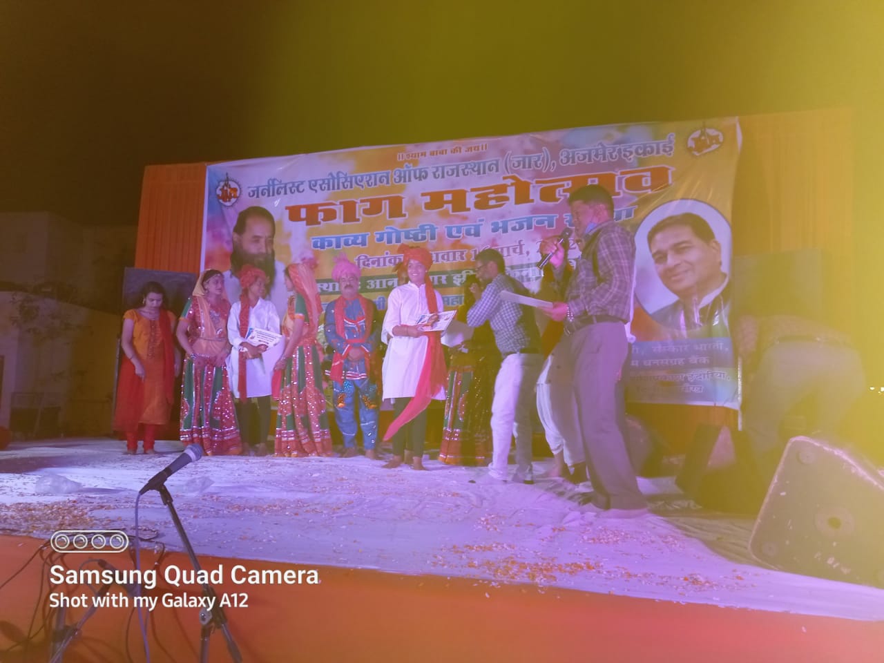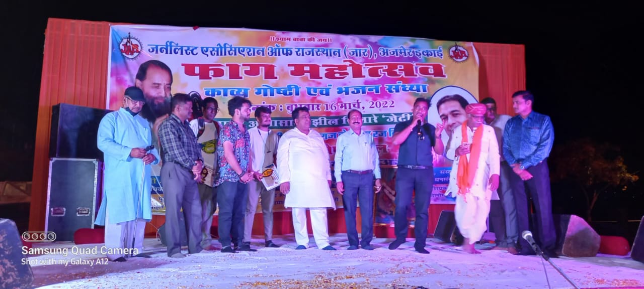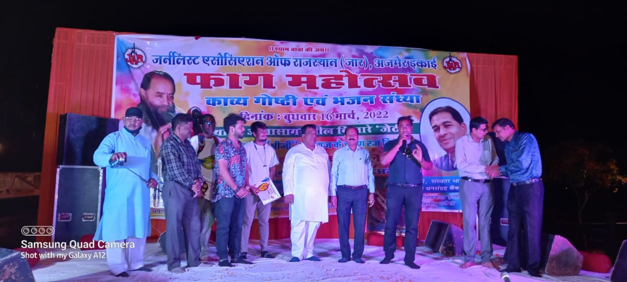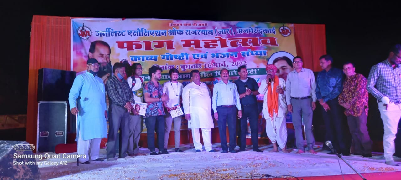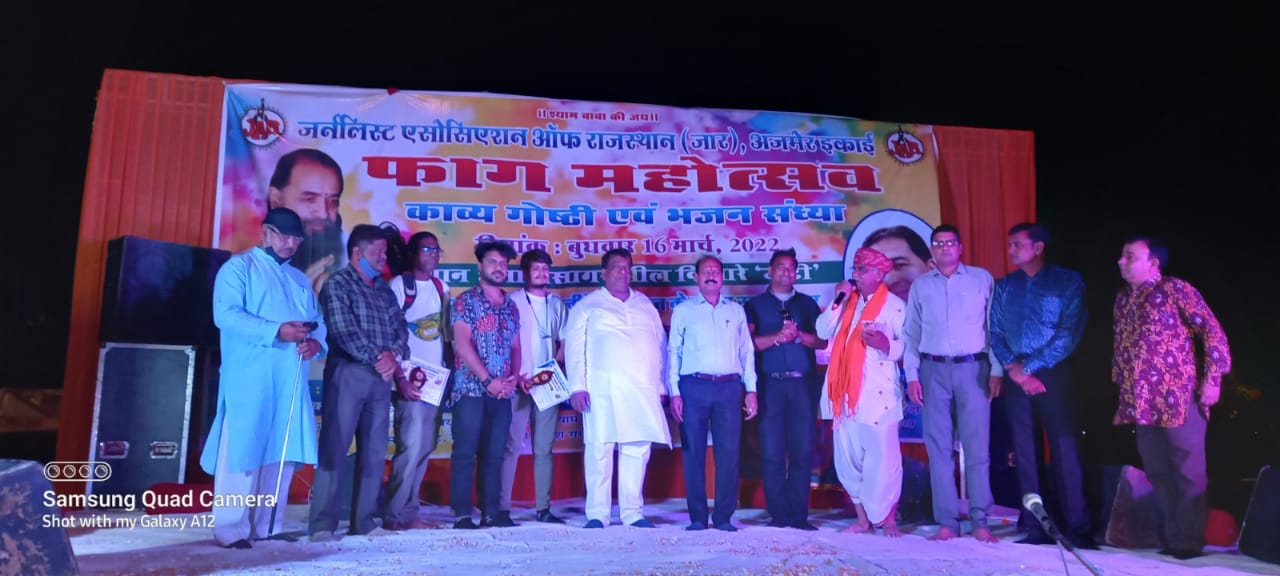 आनासागर झील किनारे जर्नलिस्ट एसोसिएशन ऑफ राजस्थान (जार) के फाग महोत्सव में भजनों-गीतों की फुहार और फूलों की वर्षा हुई। हर कोई फाग की मस्ती में सराबोर था इस अवसर पर जर्नलिस्ट एसोसिएशन ऑफ राजस्थान के प्रदेशाध्यक्ष हरीबल्लभ मेघवाल , प्रसिद्ध नाड़ी वैद्य पूरण सिंह, समाजसेवी राजेंद्र गोयल, महेश चौहान, शिव कुमार बंसल, महेश चौहान, बालमुकुंद टाक, सुनीता चौहान, सतीश बंसल, श्याम बिहारी शर्मा, कोसिनोक जैन, पूनमचंद मारोठिया, राजीव लोचन शर्मा, कमल गंगवाल, अमर सिंह राठौड़, राजेंद्र गांधी, अशोक ब्डमेचा, पार्षद बीना टांक, श्याम प्रजापति, एडवोकेट ओ पी भट्ट, बबिता टांक, नेमीचंद तम्बोली सहित नगर के प्रमुख गणमान्य व्यक्ति उपस्थित थे।