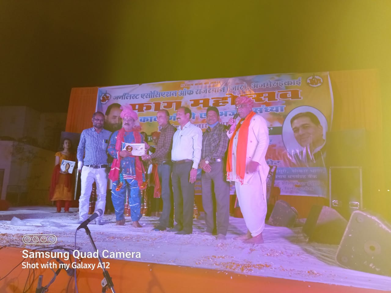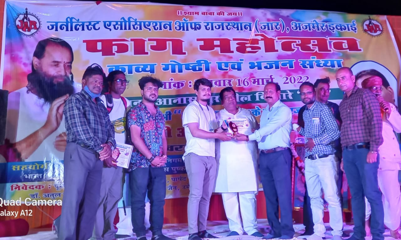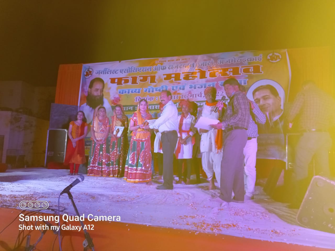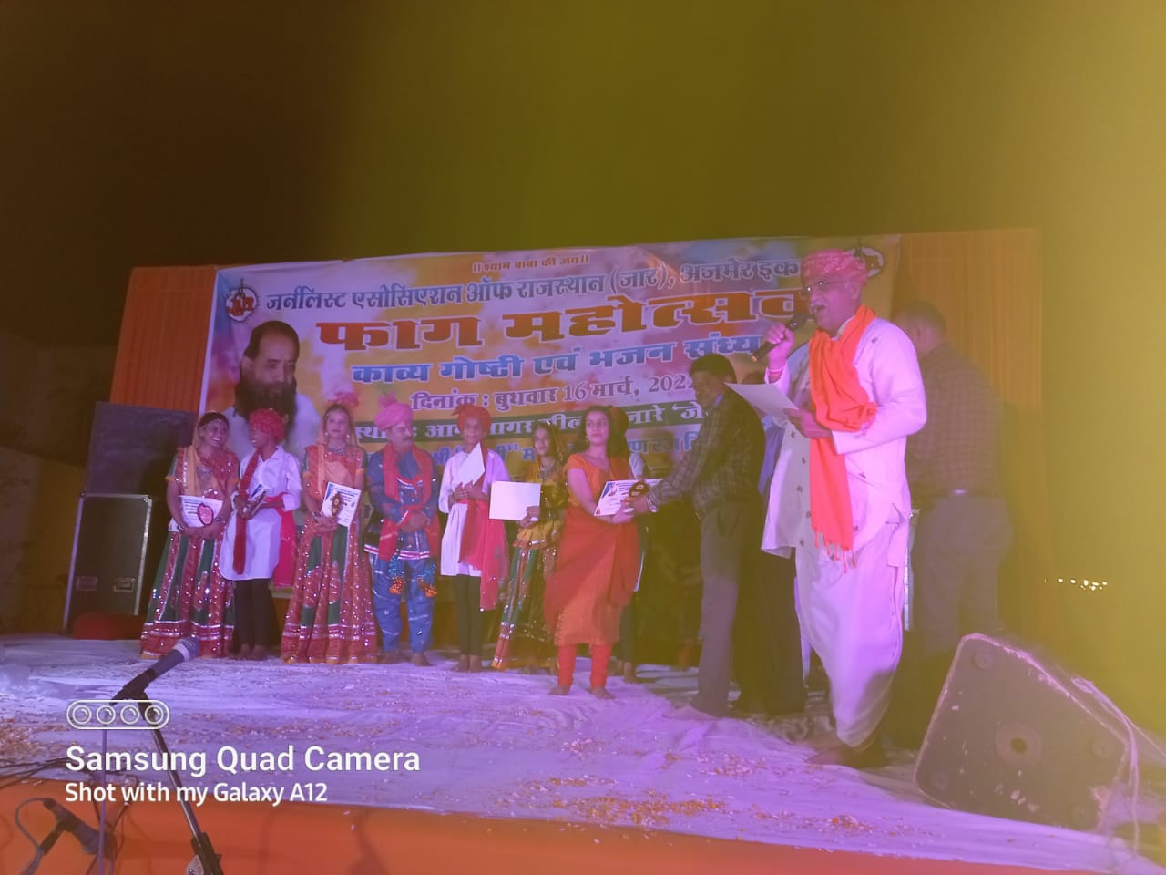 आनासागर झील किनारे जर्नलिस्ट एसोसिएशन ऑफ राजस्थान (जार) के फाग महोत्सव में भजनों-गीतों की फुहार और फूलों की वर्षा हुई। हर कोई फाग की मस्ती में सराबोर था इस अवसर पर जर्नलिस्ट एसोसिएशन ऑफ राजस्थान के प्रदेशाध्यक्ष हरीबल्लभ मेघवाल , प्रसिद्ध नाड़ी वैद्य पूरण सिंह, समाजसेवी राजेंद्र गोयल, महेश चौहान, शिव कुमार बंसल, महेश चौहान, बालमुकुंद टाक, सुनीता चौहान, सतीश बंसल, श्याम बिहारी शर्मा, कोसिनोक जैन, पूनमचंद मारोठिया, राजीव लोचन शर्मा, कमल गंगवाल, अमर सिंह राठौड़, राजेंद्र गांधी, अशोक ब्डमेचा, पार्षद बीना टांक, श्याम प्रजापति, एडवोकेट ओ पी भट्ट, बबिता टांक, नेमीचंद तम्बोली सहित नगर के प्रमुख गणमान्य व्यक्ति उपस्थित थे।