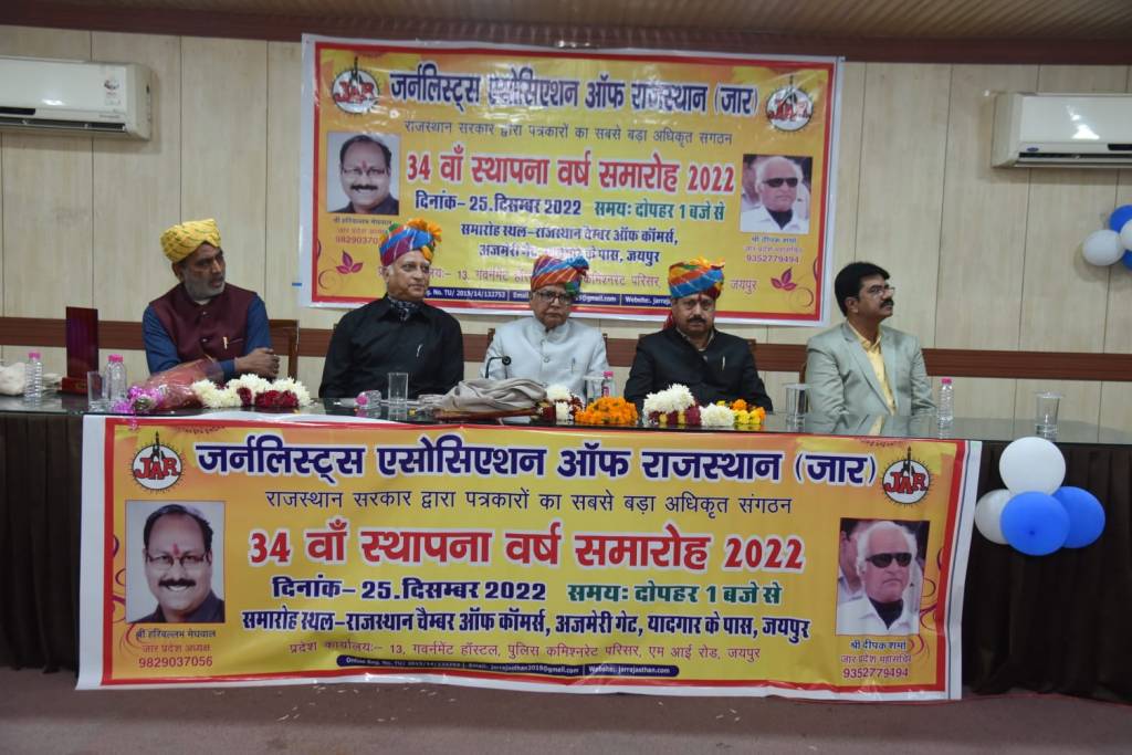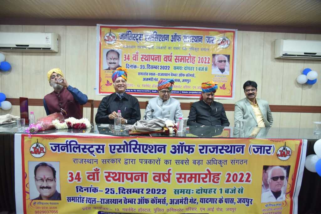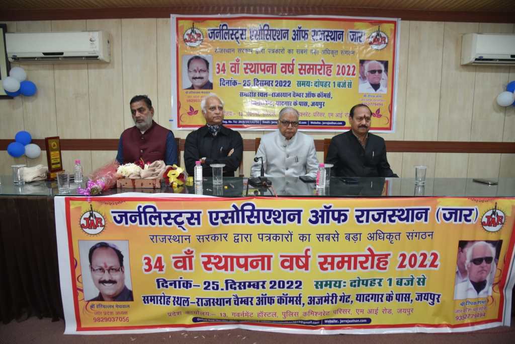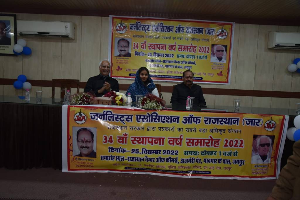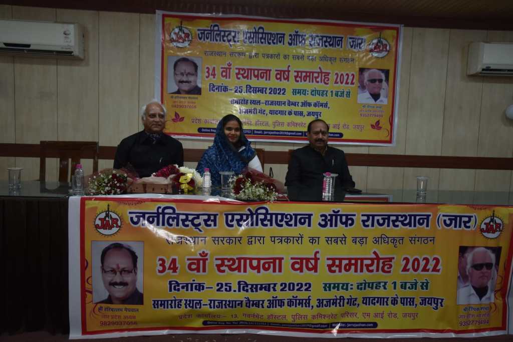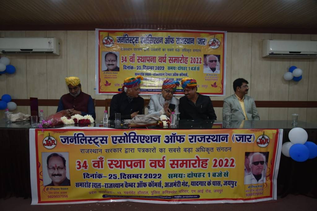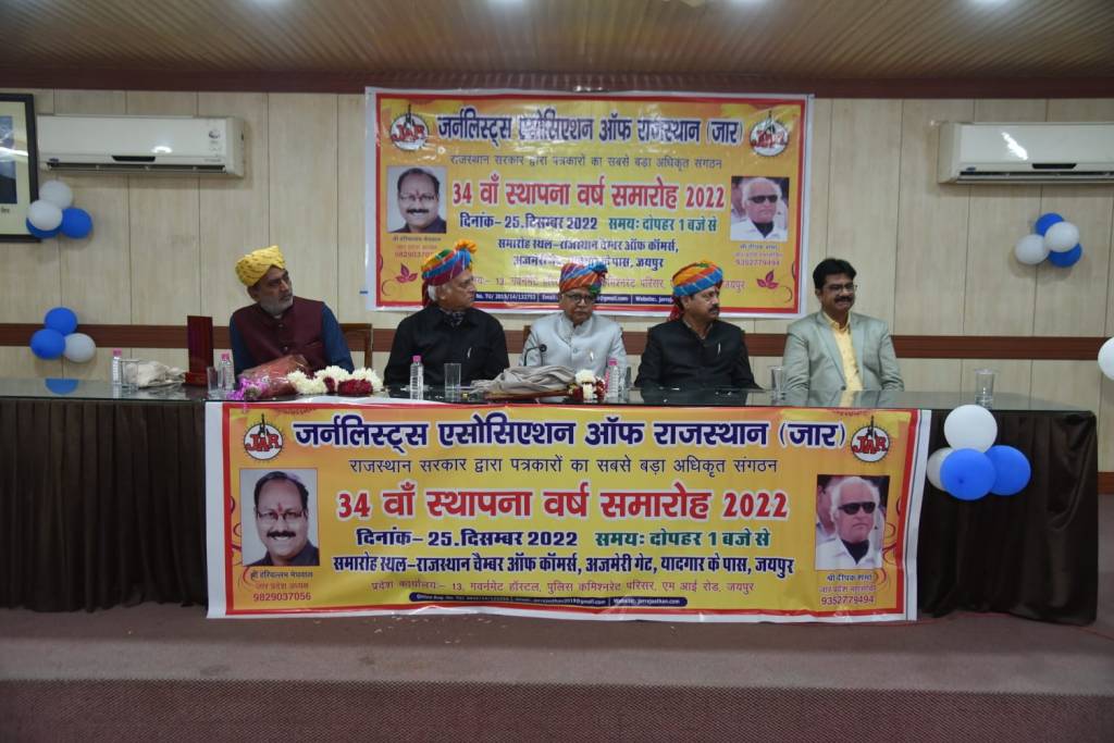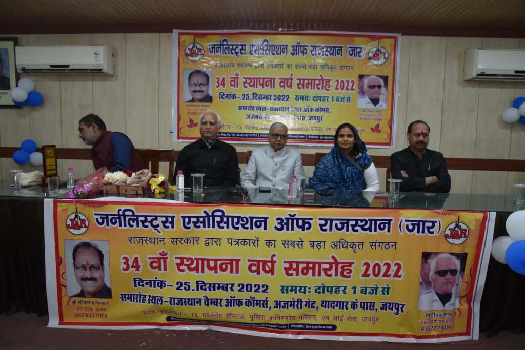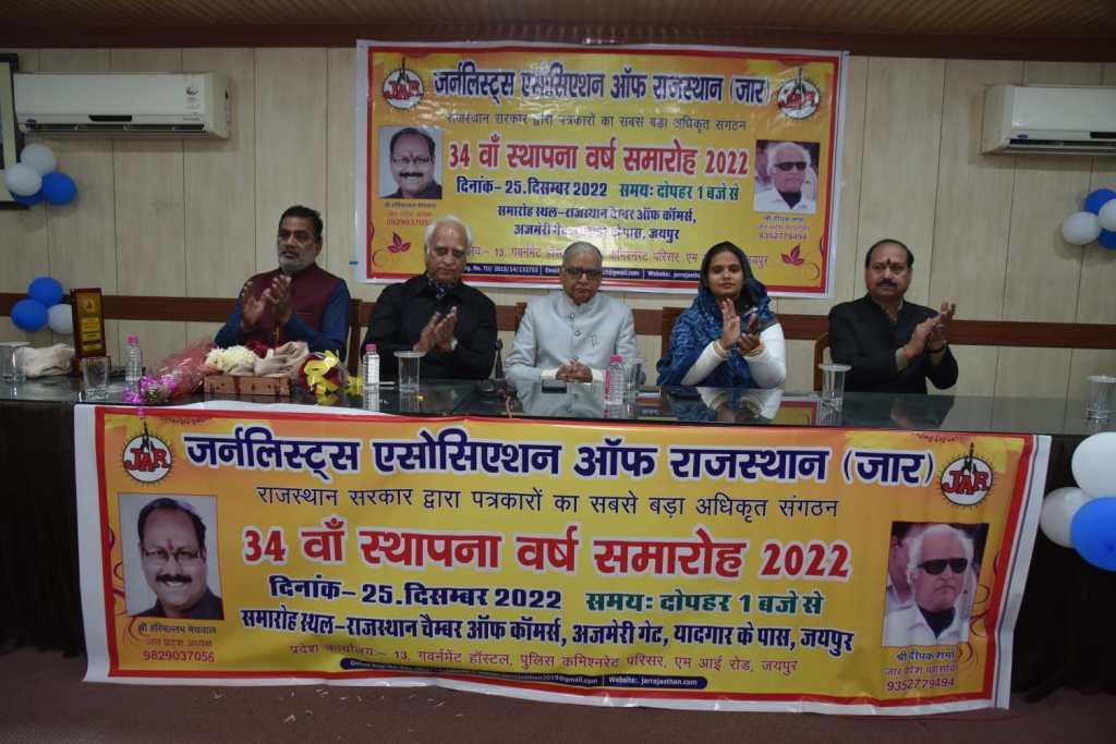 जर्नलिस्ट एसोसिएशन ऑफ राजस्थान जार के 34 वें स्थापना दिवस का भव्य समारोह गत रविवार 25 दिसम्बर को दोपहर 1.00 बजे राजस्थान चेंबर ऑफ कॉमर्स भवन, जयपुर में हर्षोल्लास के साथ मनाया गया। कार्यक्रम में मुख्य अतिथि के रूप में मुनेश गुर्जर मेयर,नगर निगम हेरिटेज,जयपुर एवं कार्यक्रम अध्यक्ष के रूप में मुख्यमंत्री के विशेष सलाहकार अधिकारी फ़ारुक़ आफ़रीदी ने शिरक़त की। जार के 34वें स्थापना दिवस के इस समारोह में लगभग 40 पत्रकारों का सम्मान किया गया। जिनमें 50 से ज्यादा समय से चलने वाले समाचार पत्र,70 वर्ष की उम्र से ज्यादा वरिष्ठ पत्रकारों एवं पत्रकारिता के क्षेत्र में कर्मठता से कार्य कर रही महिला संपादकों एवं पत्रकारों का सम्मान किया गया।