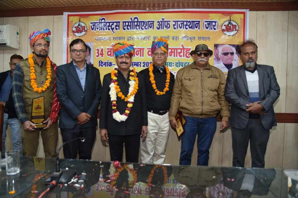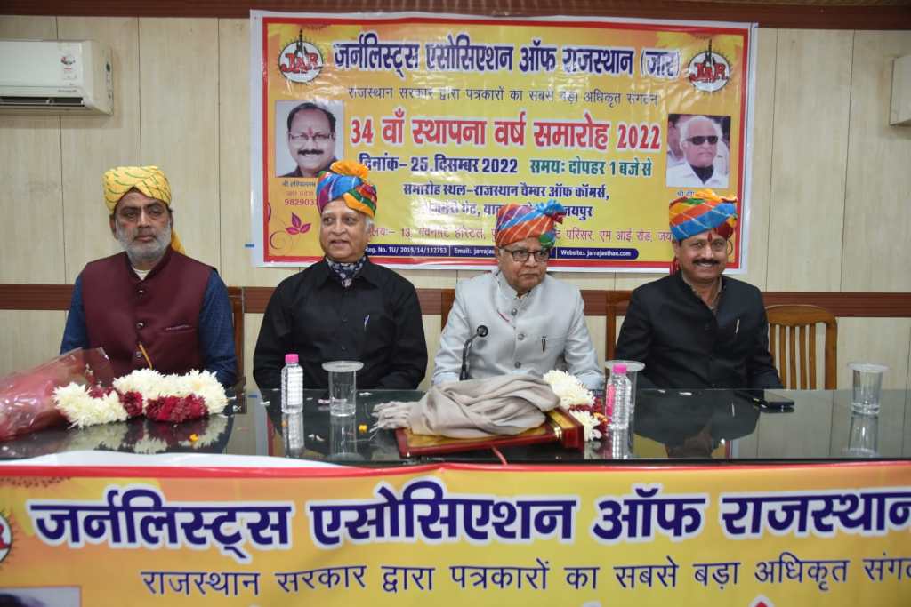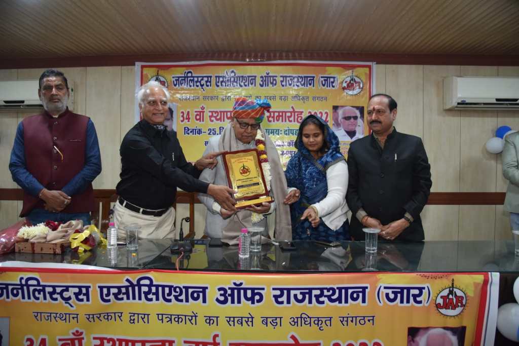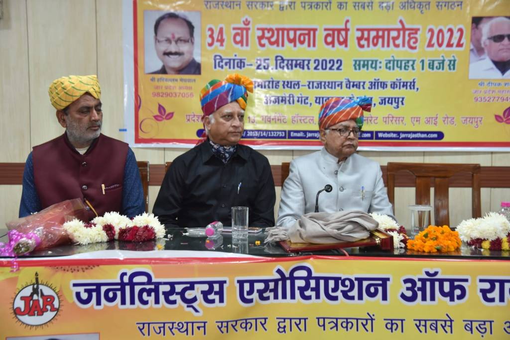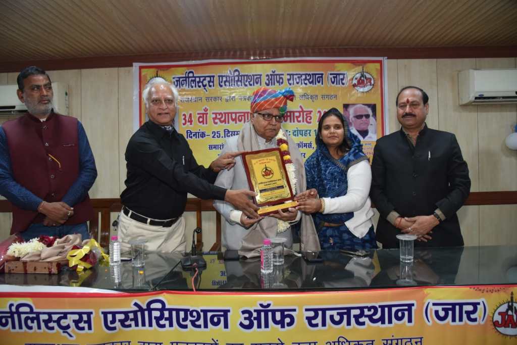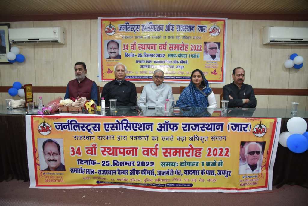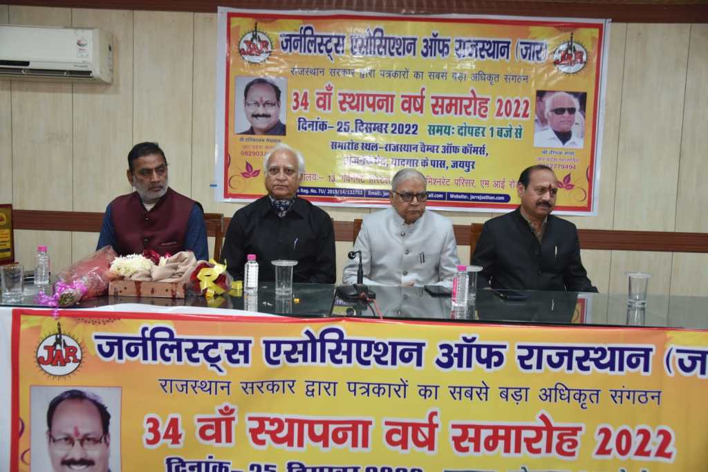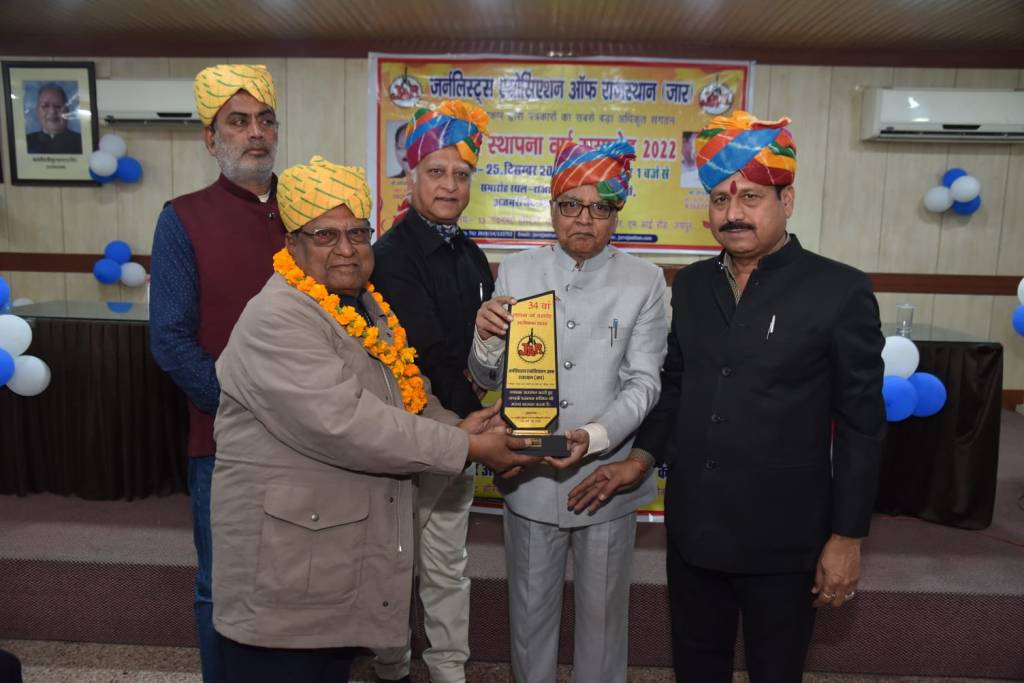 जर्नलिस्ट एसोसिएशन ऑफ राजस्थान जार के 34 वें स्थापना दिवस का भव्य समारोह गत रविवार 25 दिसम्बर को दोपहर 1.00 बजे राजस्थान चेंबर ऑफ कॉमर्स भवन, जयपुर में हर्षोल्लास के साथ मनाया गया। कार्यक्रम में मुख्य अतिथि के रूप में मुनेश गुर्जर मेयर,नगर निगम हेरिटेज,जयपुर एवं कार्यक्रम अध्यक्ष के रूप में मुख्यमंत्री के विशेष सलाहकार अधिकारी फ़ारुक़ आफ़रीदी ने शिरक़त की। जार के 34वें स्थापना दिवस के इस समारोह में लगभग 40 पत्रकारों का सम्मान किया गया। जिनमें 50 से ज्यादा समय से चलने वाले समाचार पत्र,70 वर्ष की उम्र से ज्यादा वरिष्ठ पत्रकारों एवं पत्रकारिता के क्षेत्र में कर्मठता से कार्य कर रही महिला संपादकों एवं पत्रकारों का सम्मान किया गया।