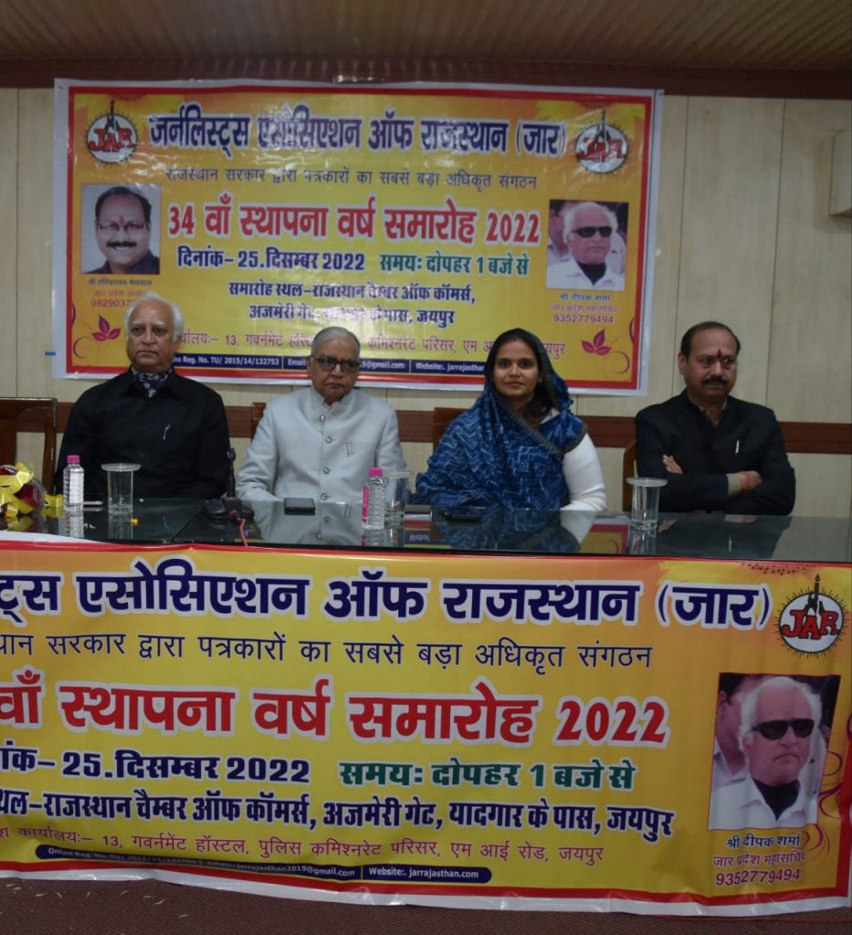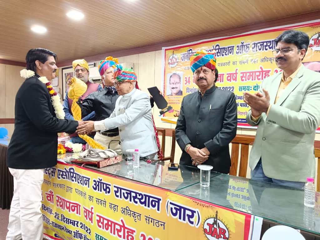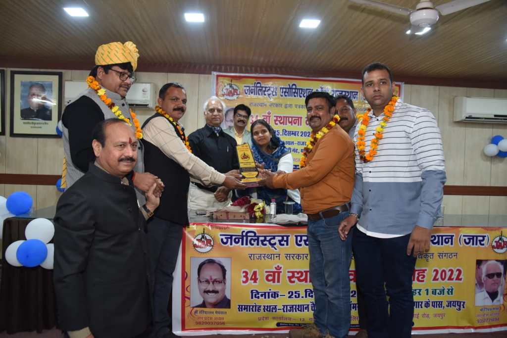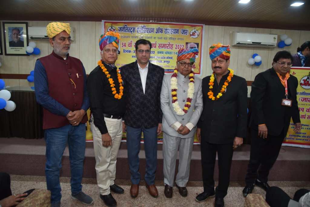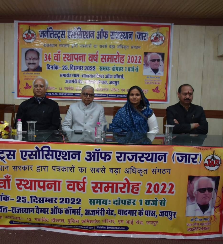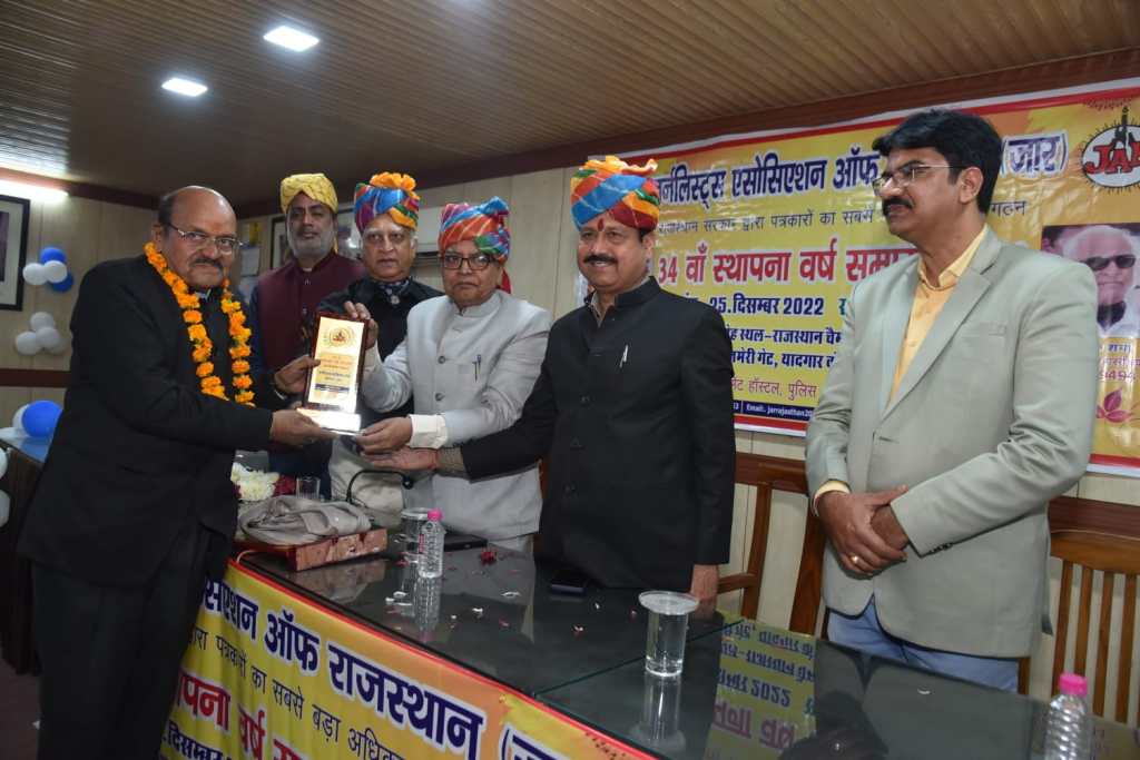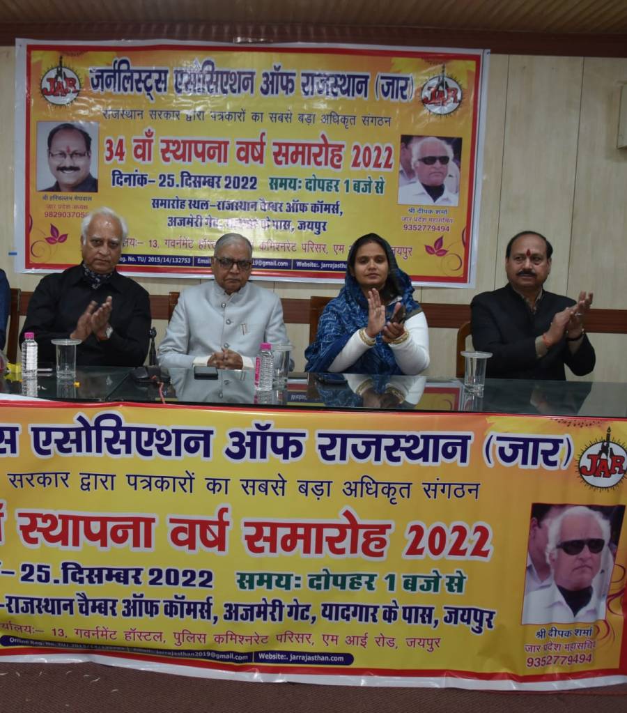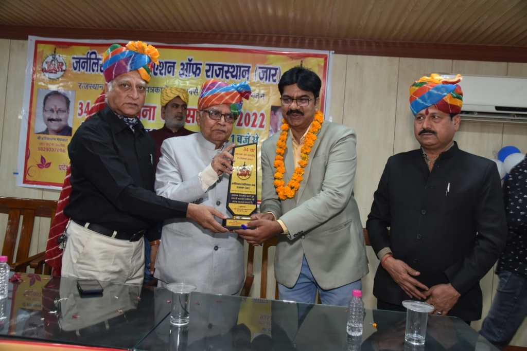 जर्नलिस्ट एसोसिएशन ऑफ राजस्थान जार के 34 वें स्थापना दिवस का भव्य समारोह गत रविवार 25 दिसम्बर को दोपहर 1.00 बजे राजस्थान चेंबर ऑफ कॉमर्स भवन, जयपुर में हर्षोल्लास के साथ मनाया गया। कार्यक्रम में मुख्य अतिथि के रूप में मुनेश गुर्जर मेयर,नगर निगम हेरिटेज,जयपुर एवं कार्यक्रम अध्यक्ष के रूप में मुख्यमंत्री के विशेष सलाहकार अधिकारी फ़ारुक़ आफ़रीदी ने शिरक़त की। जार के 34वें स्थापना दिवस के इस समारोह में लगभग 40 पत्रकारों का सम्मान किया गया। जिनमें 50 से ज्यादा समय से चलने वाले समाचार पत्र,70 वर्ष की उम्र से ज्यादा वरिष्ठ पत्रकारों एवं पत्रकारिता के क्षेत्र में कर्मठता से कार्य कर रही महिला संपादकों एवं पत्रकारों का सम्मान किया गया।