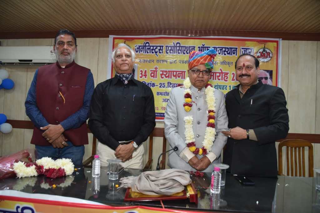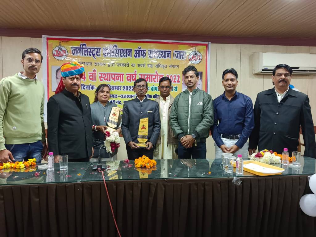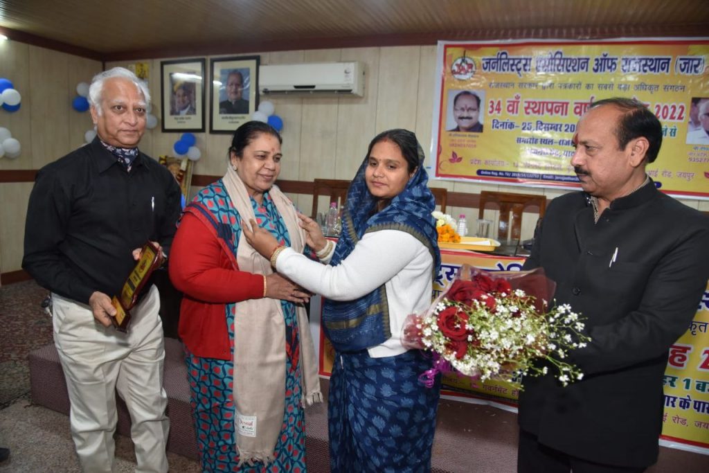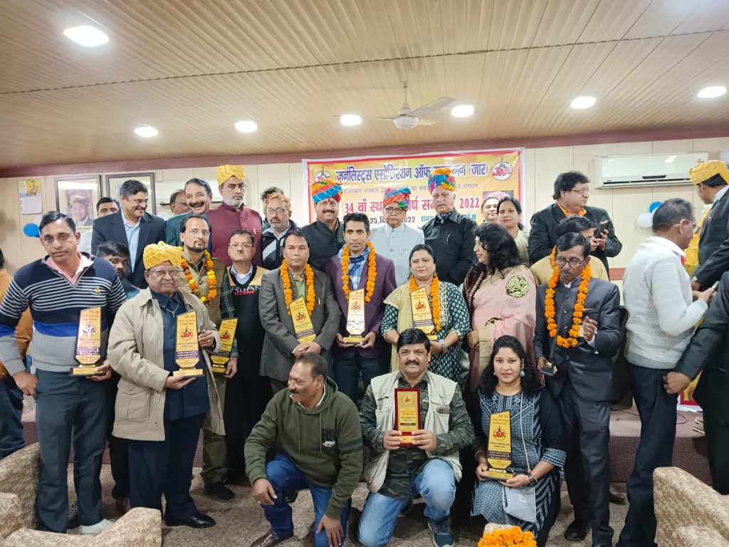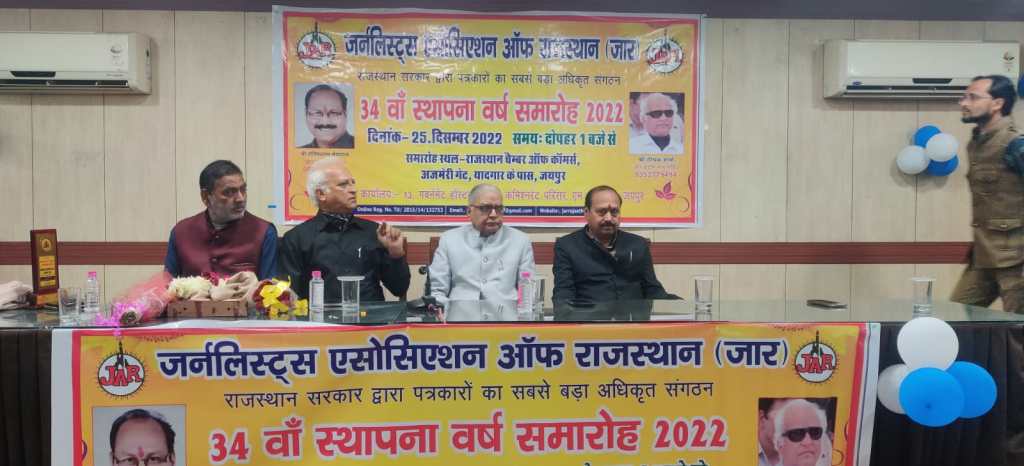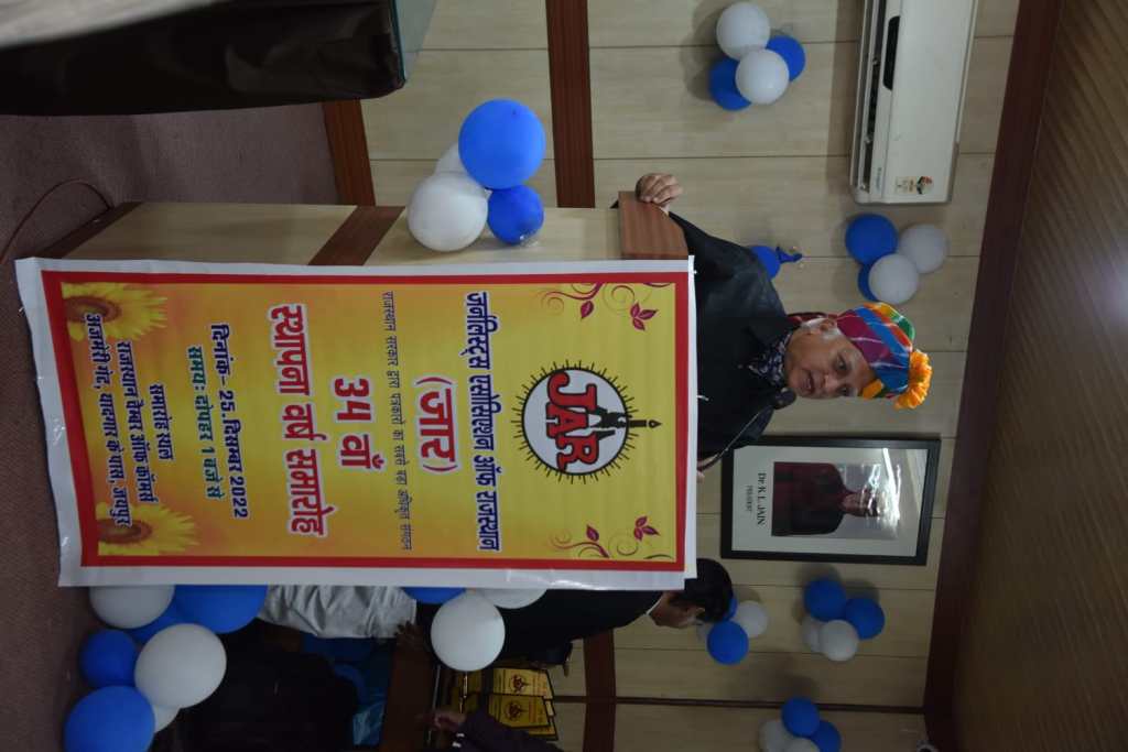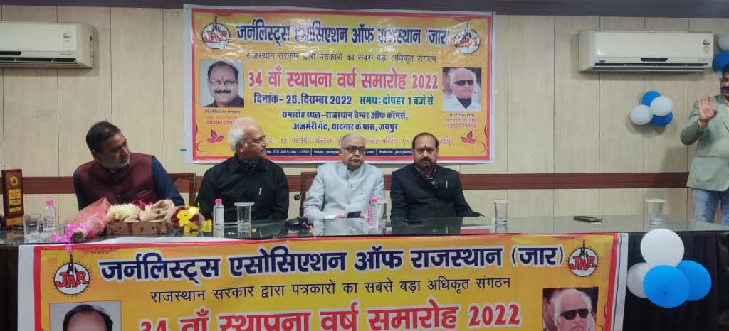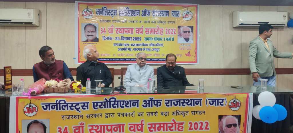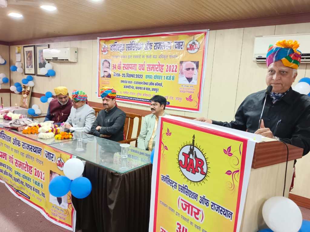 जर्नलिस्ट एसोसिएशन ऑफ राजस्थान जार के 34 वें स्थापना दिवस का भव्य समारोह गत रविवार 25 दिसम्बर को दोपहर 1.00 बजे राजस्थान चेंबर ऑफ कॉमर्स भवन, जयपुर में हर्षोल्लास के साथ मनाया गया। कार्यक्रम में मुख्य अतिथि के रूप में मुनेश गुर्जर मेयर,नगर निगम हेरिटेज,जयपुर एवं कार्यक्रम अध्यक्ष के रूप में मुख्यमंत्री के विशेष सलाहकार अधिकारी फ़ारुक़ आफ़रीदी ने शिरक़त की। जार के 34वें स्थापना दिवस के इस समारोह में लगभग 40 पत्रकारों का सम्मान किया गया। जिनमें 50 से ज्यादा समय से चलने वाले समाचार पत्र,70 वर्ष की उम्र से ज्यादा वरिष्ठ पत्रकारों एवं पत्रकारिता के क्षेत्र में कर्मठता से कार्य कर रही महिला संपादकों एवं पत्रकारों का सम्मान किया गया।